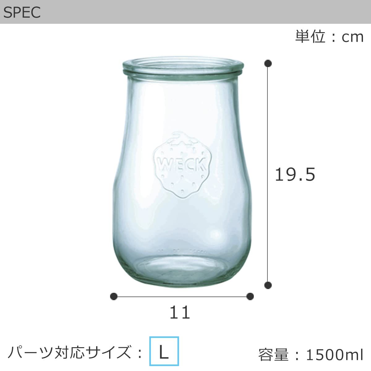 ×4【サイズ】約直径11×H19.5cm(別売のフタ・パッキンはL対応)【容量】1500ml【素材】ガラス【耐熱温度差】80℃【生産国】ドイツ
