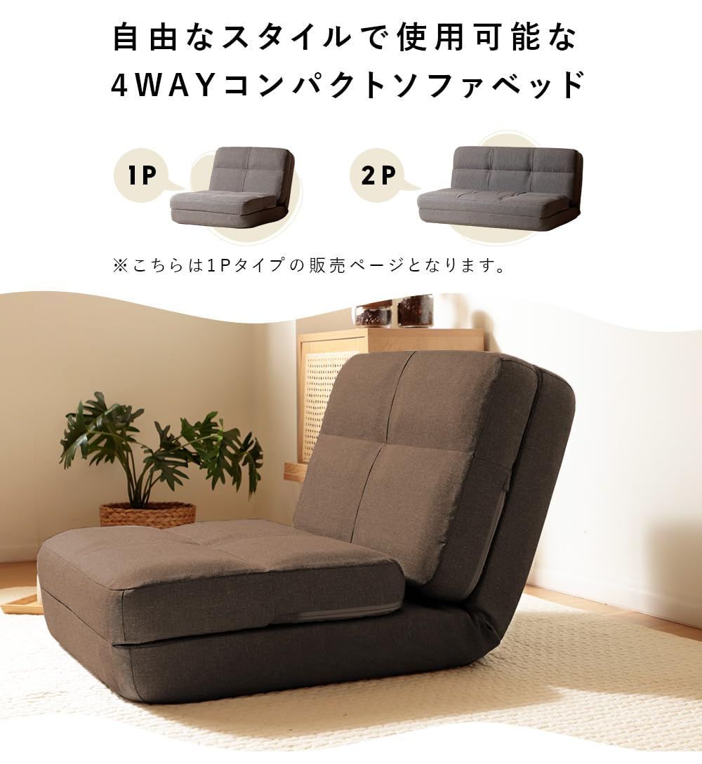 コンパクトな1人掛けサイズの4WAYソファベッド。ソファ、カウチ、ベッドに加え、背もたれが枕になるスタイルの全4種類に変形可能。背もたれは14段階のリクライニング機能付き。座面には弾力のあるウレタンを使用し、底付き感のない快適な座り心地で、身体をやさしく包み込みます。